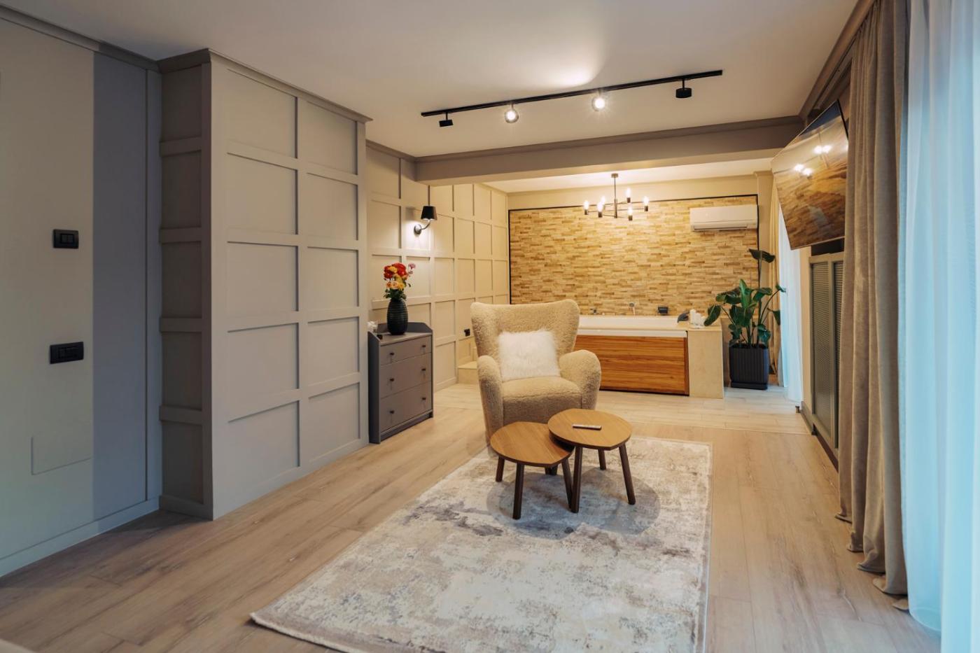 Junior Suite with Balcony and Private Jacuzzi. Guests will have a special experience as this suite offers a hot tub and a sauna. This air-conditioned suite includes a flat-screen TV with cable channels, a private bathroom as well as a terrace with garden views.