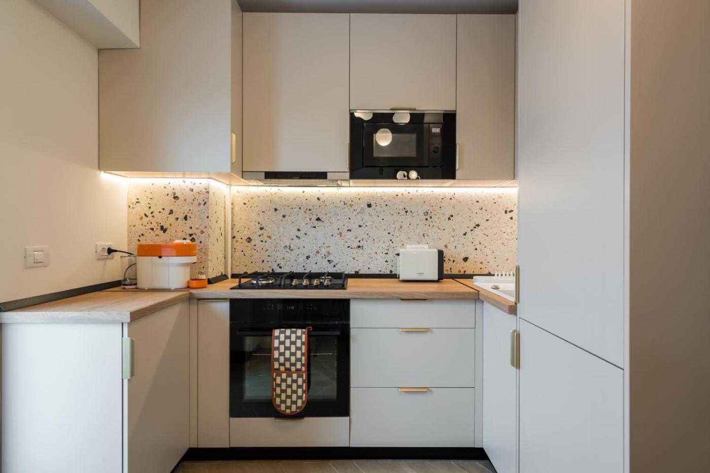 One-Bedroom Apartment. The air-conditioned apartment has 1 bedroom and 1 bathroom with a shower and a hairdryer. Guests can make meals in the kitchen that is fitted with a refrigerator, an oven, a microwave and a tea and coffee maker. Boasting a balcony with city views, this apartment also offers a washing machine and a flat-screen TV with streaming services. The unit has 1 bed.