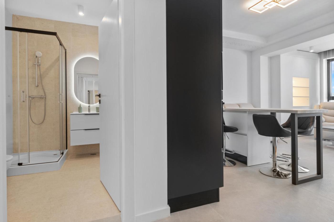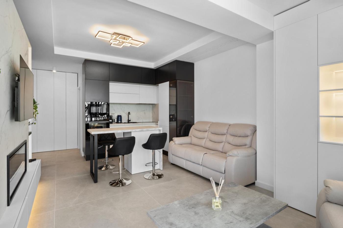 One-Bedroom Apartment. This apartment offers a fireplace. Featuring a private entrance, this air-conditioned apartment comprises 1 living room, 1 separate bedroom and 2 bathrooms with a walk-in shower and a bath. In the well-fitted kitchen, guests will find a stovetop, a refrigerator, a dishwasher and kitchenware. Boasting a terrace with sea views, this apartment also provides a washing machine and a flat-screen TV with satellite channels. The unit offers 2 beds.