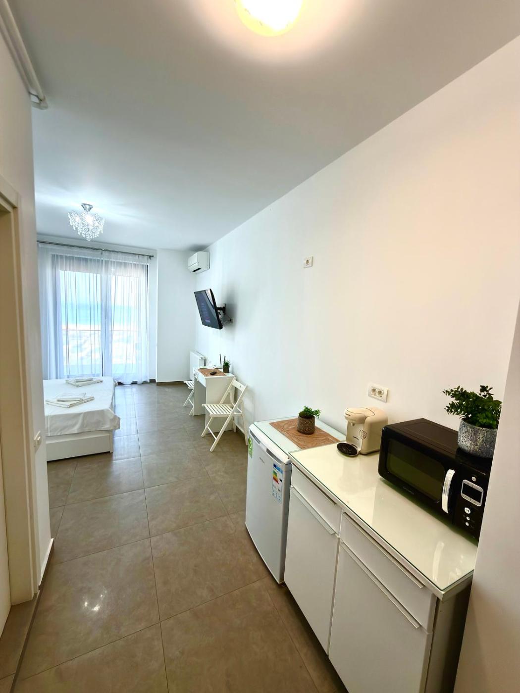 King Suite with Sea View. Featuring a private entrance, this air-conditioned suite is comprised of a kitchenette, 1 bedroom and 1 bathroom with a walk-in shower and a hairdryer. In the fully equipped kitchenette, guests will find a refrigerator, a microwave, a tea and coffee maker and a toaster. Boasting a terrace with sea views, this suite also offers a washing machine and a flat-screen TV with streaming services. The unit offers 1 bed.