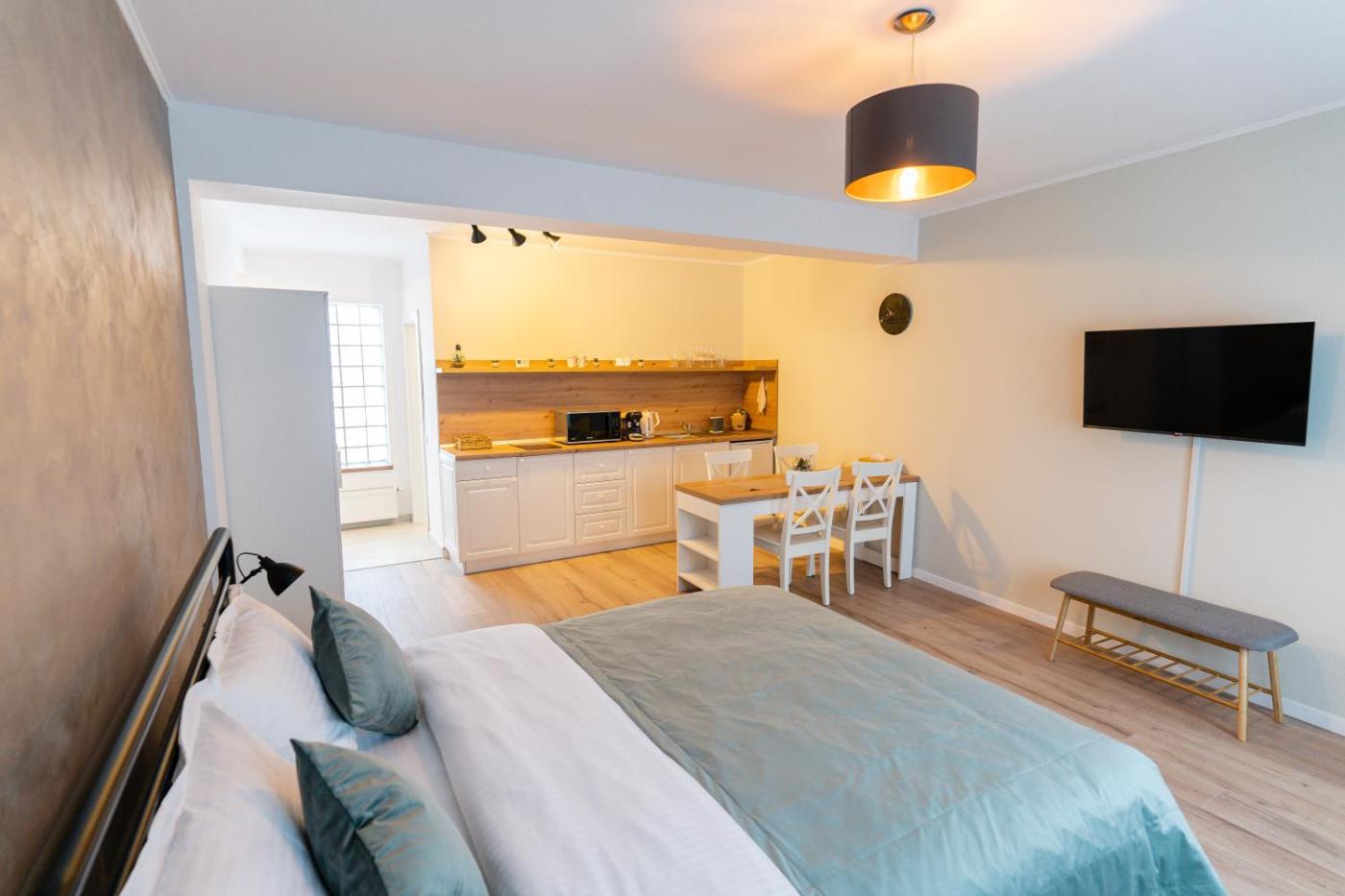 One-Bedroom Apartment. This apartment comes with 1 bedroom, a kitchenette and 1 bathroom with a shower and a hairdryer. Guests can make meals in the kitchenette that features a stovetop, a refrigerator, kitchenware and a microwave. The apartment features a tea and coffee maker, a wardrobe, parquet floors, heating, as well as a flat-screen TV with cable channels. The unit has 1 bed. ;
