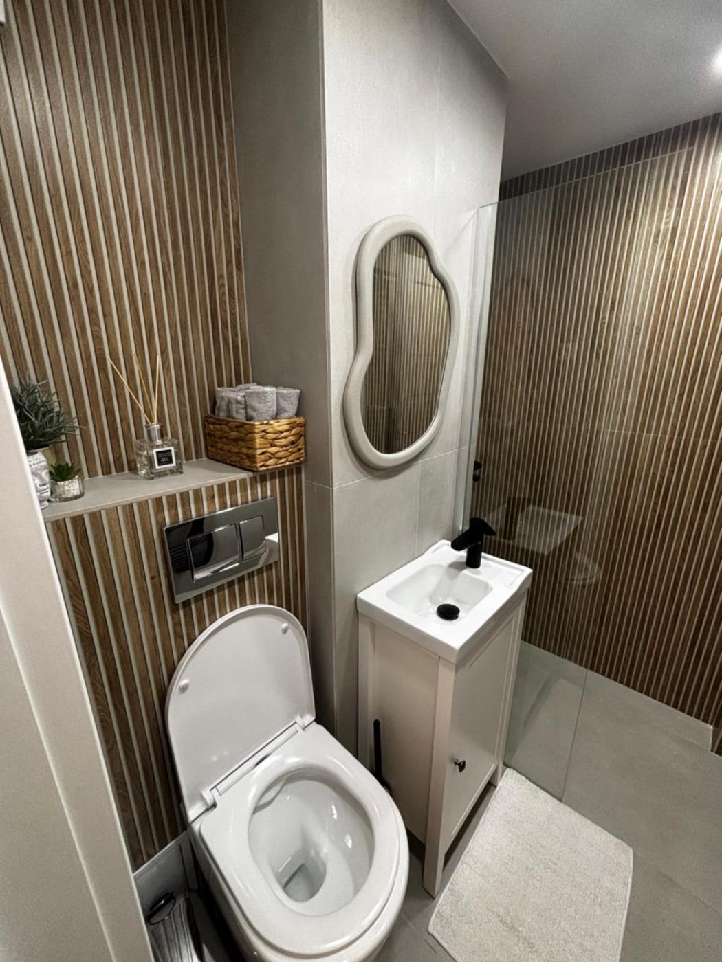 One-Bedroom Apartment. This air-conditioned apartment comes with 1 living room, 1 separate bedroom and 1 bathroom with a walk-in shower. In the kitchen, guests will find a stovetop, a refrigerator, kitchenware and a microwave. The apartment has parquet floors, a seating area with a flat-screen TV, a washing machine, a tea and coffee maker, as well as a dining area. The unit has 2 beds.